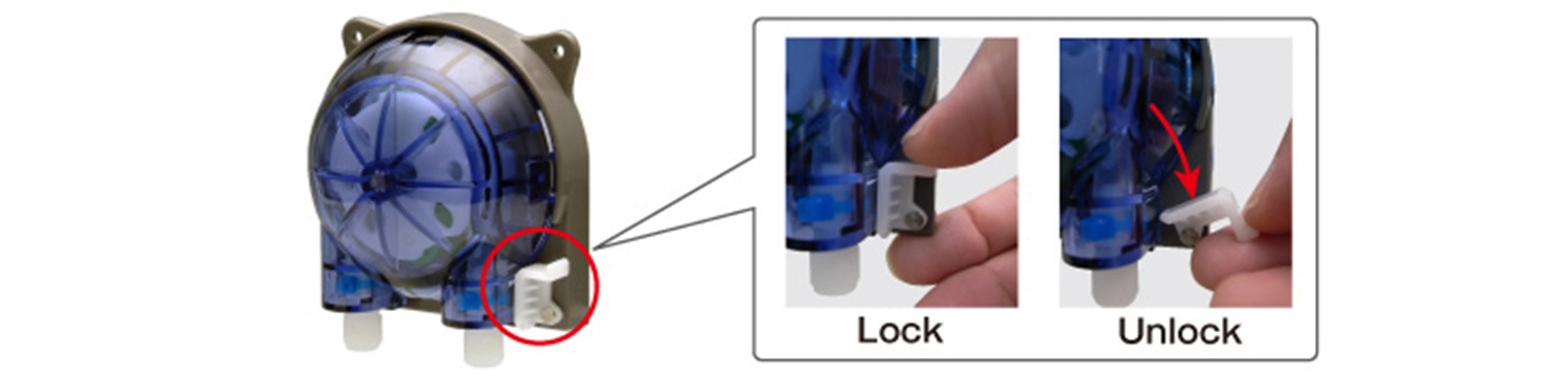 La nouvelle fonction vous permet de verrouiller ou de déverrouiller facilement le boîtier. Cela évite que le boîtier ne tombe lorsqu'il est nécessaire de faire fonctionner la pompe dans les deux sens. Ceci est disponible en option.
